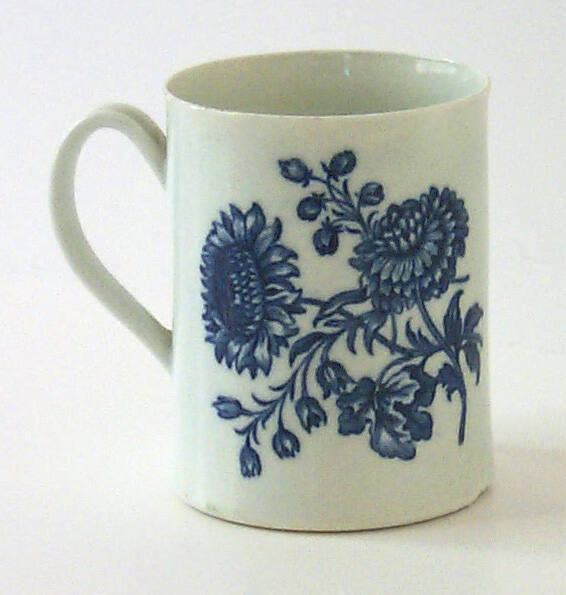 DescriptionCylindrical with slightly flared base and rim, c-shaped handle, flowers and leaves on outside.