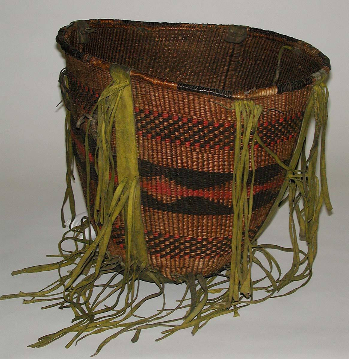 DescriptionThree bands; top and bottom, red and black diapered pattern on natural buff. Center band, red and buff diamonds on black band. tassels hanging from mouth. bottom cover.