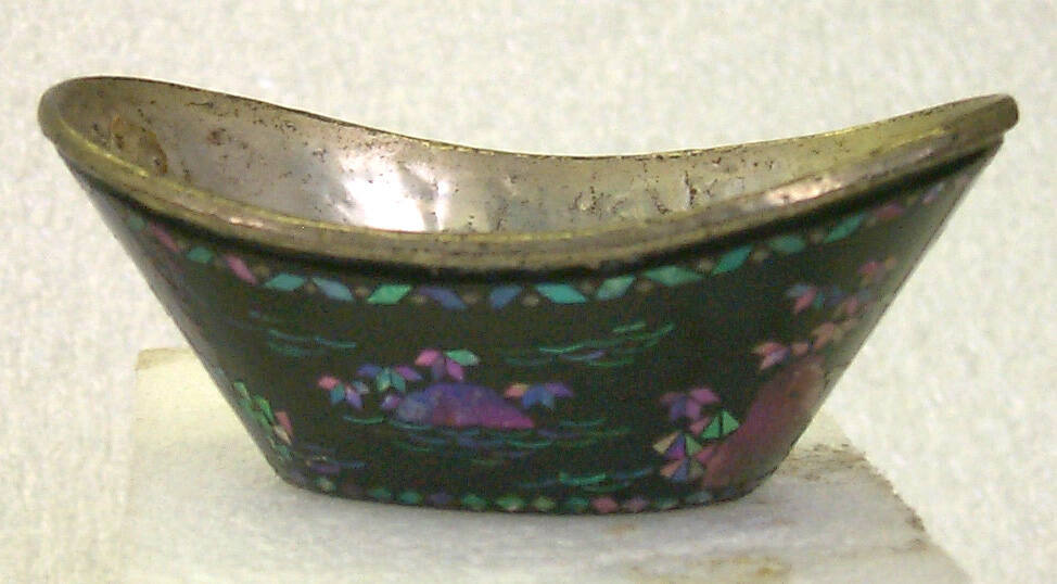 DescriptionThe set of eight wine cups are in the shape of a Chinese gold or silver ingot, but of different sizes ranging from 5.5 cm. to 12 cm. in length. The size increases at a regular rate so that each cup, when piled up, may nestle comfortably in the next one. These black lacquered cups are silver inside, while the outer surfaces are decorated with Chinese garden scenes in mother-of-pearl inlay. The landscape on each cup has a band of geometric pattern along its top and bottom borders. The iridescent figures, rocks, pavilions, willows and wu-t'ung trees on the larger cups gradually dwindle to mere geometric leaves against a black background on the smallest one.