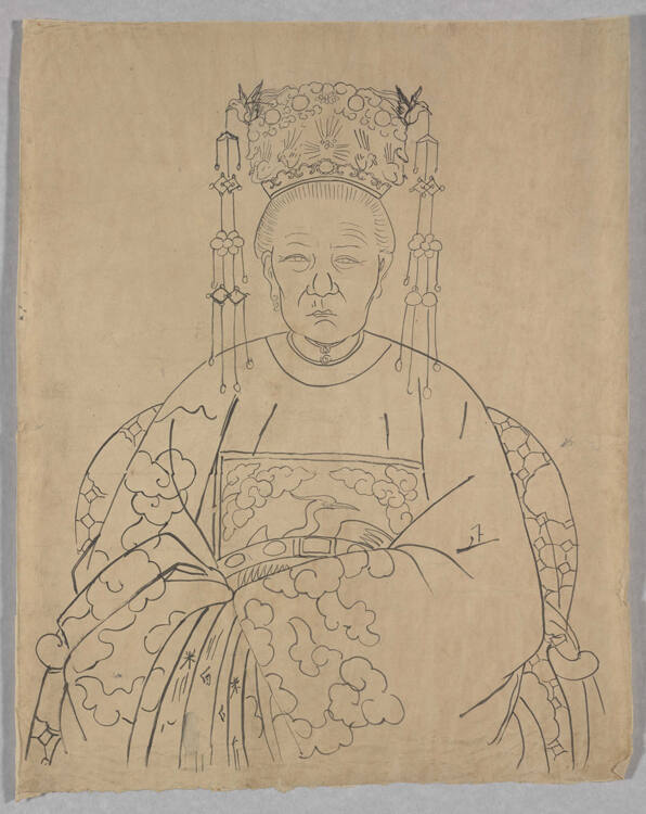 DescriptionThree-quarter length elaborately clothed figure with headdress, seated on curved throne.