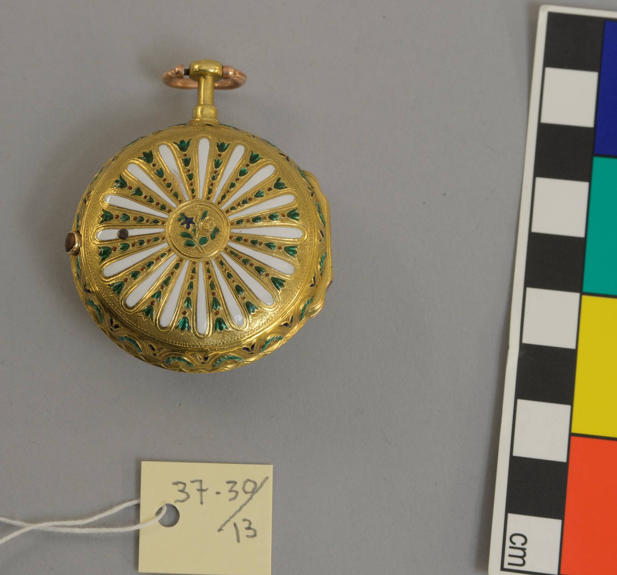 DescriptionWatch with hinged gold case decorated with sunburst desgin in white enamel on back with green leaves and red dots.White face with Roman numerals.