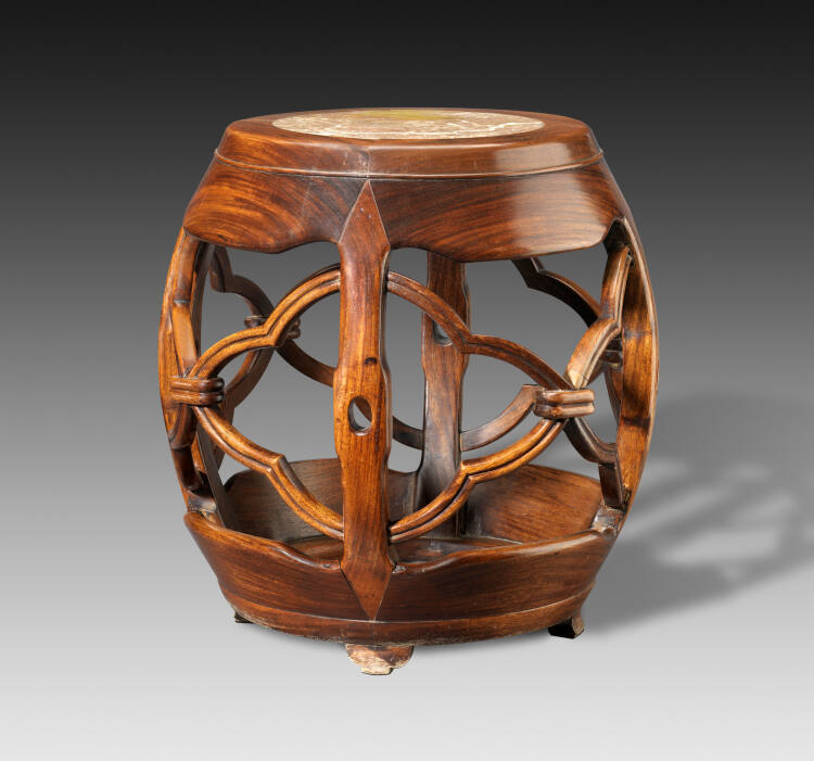 This openwork wood stool imitates stools that were originally constructed out of ovals of cane bound together. Sitting on stools was considered good for posture, as the cat in this painting clearly understood.