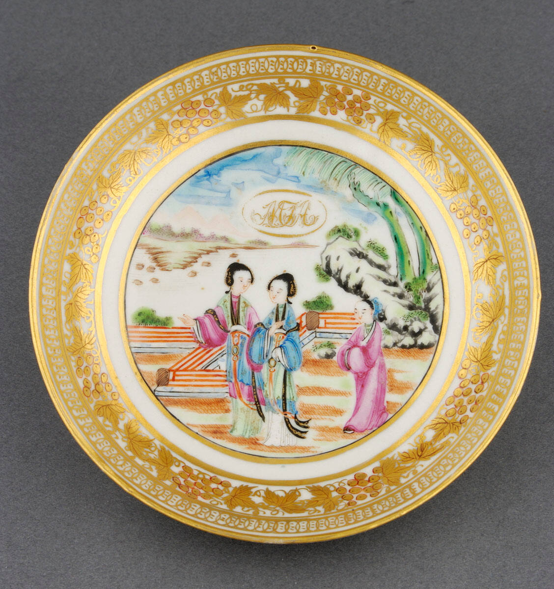 DescriptionPart of 77 piece tea service. In bottom of saucer, on exterior sides of cups is a scene painted in famille-rose style stowing 2 Chinese ladies and attendant in garden. Above figures is gold monogram, MTA (?) in gold oval. On interior sides of all pieces is border design in gold of grape bunches and leaves. On handleless cup on exterior side is also a gold spray of leaves and berries.
