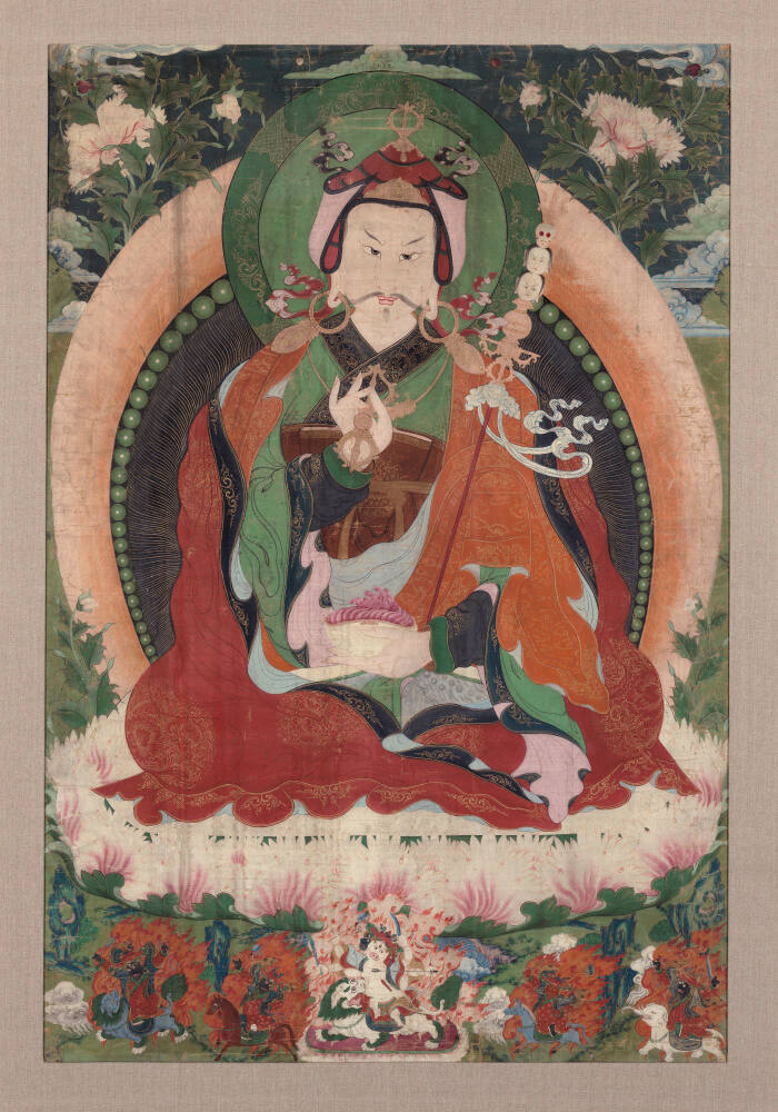 The revered teacher Padmasambhava, holding ritual implements in his hands, dominates the composition of this painting. At the bottom center of the painting may be Pehar, a protective deity whom Padmasambhava appointed as the guardian of Samye Monastery, the first Buddhist monastery in Tibet.