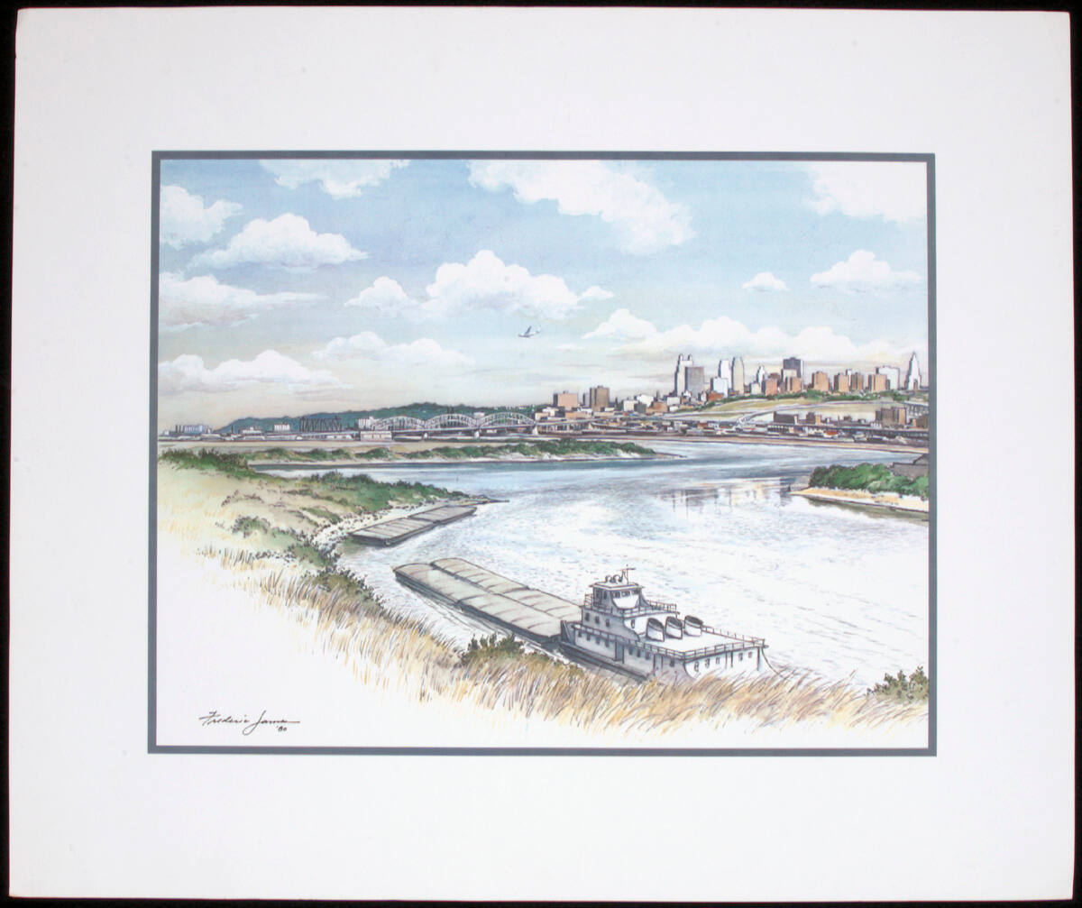 DescriptionForeground, beyond grassy shore, tug pushing four barges, two others moored beyond along near edge of jutting point, opposite point, r.m. C., green-humped peninsula around which river winds, trafficway and buildings on far shore, KC skyline on hill beyond. suspension bridge and road, c. Airplane in sky, t.c., white clouds to t.Copyright© Estate of Frederic James