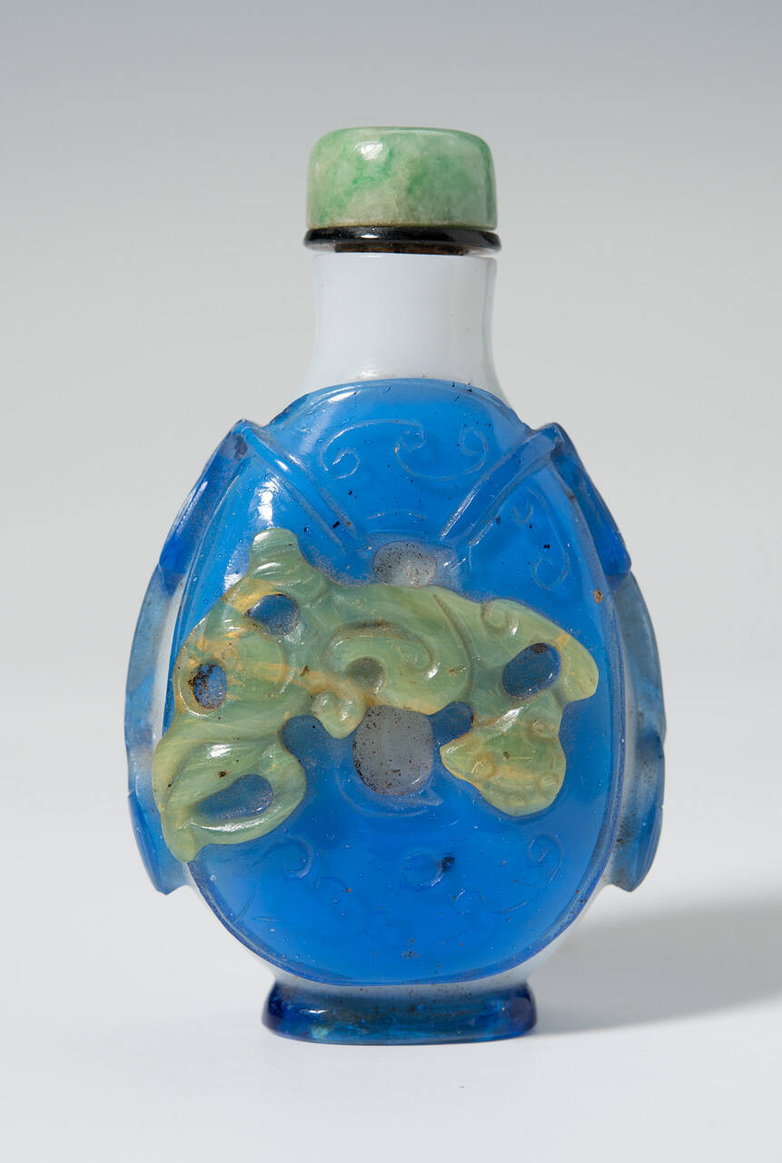 DescriptionFlattened pear-shaped, milk-glass bottle with double overlay of translucent light blue and green glass in the design of seal, flower, and hydra; black collar and Fei Ts'ui jade stopper.