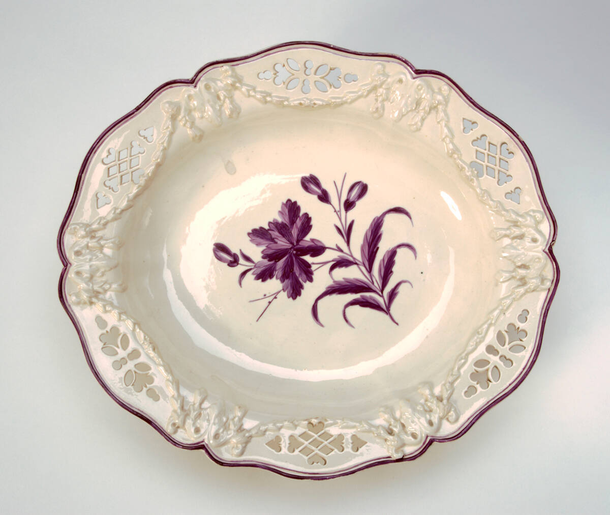DescriptionSmall shaped oval contour plate with reliefs of swags and cascades. Purple banding on rims decorated with purple floral sprays. Pierced designs.Provenance