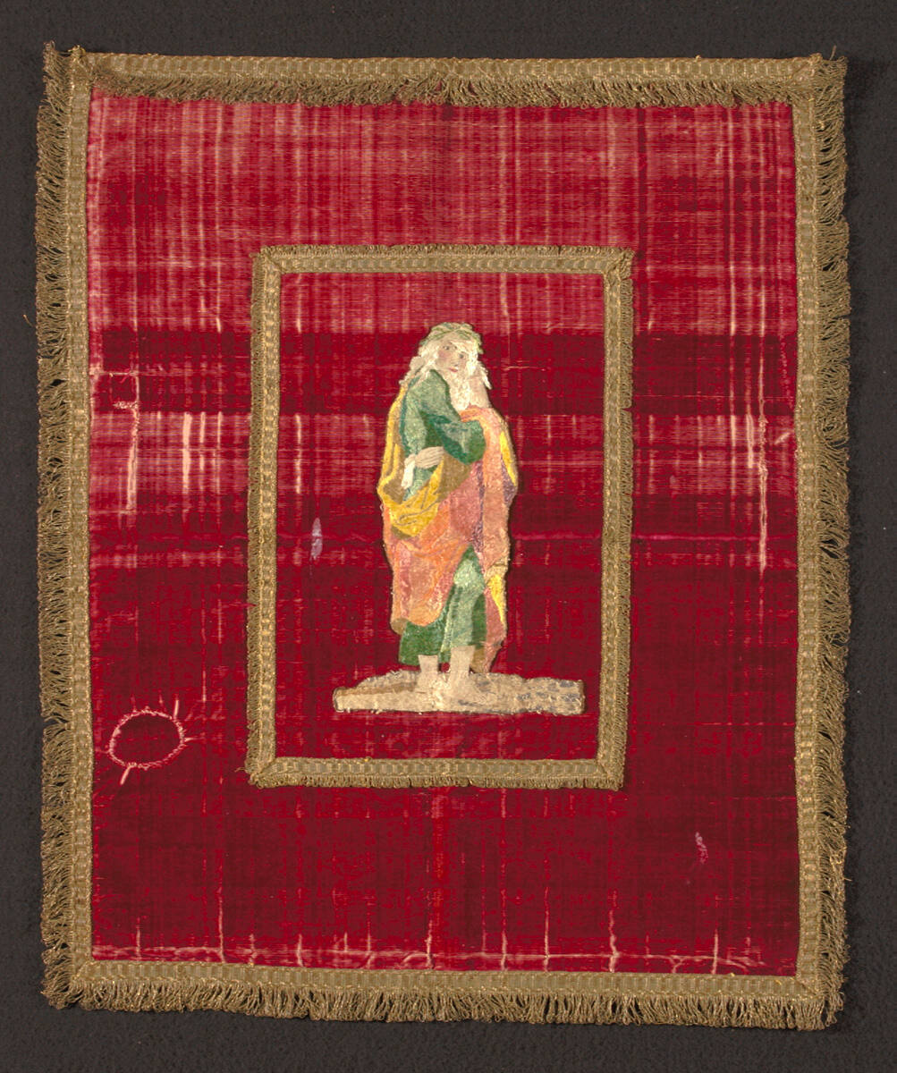 DescriptionPanel of old, solid red silk cut velvet to which is applied a cutout figure of linen embroidered with floss silks and silver thread in long-and-short and straight stitches and couched work. The borders of fringed metal braid date from the 19th century as does its linen backing.ProvenanceWith L. Maurice, by 1932;