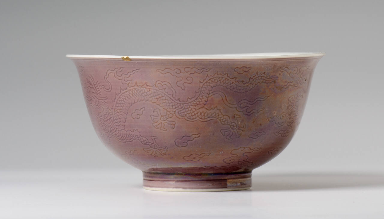 DescriptionOne of a pair of small bowls glazed a light aubergine on the exterior, and white on the interior. The exterior is engraved with designs of phoenix and dragons among clouds under the glaze.