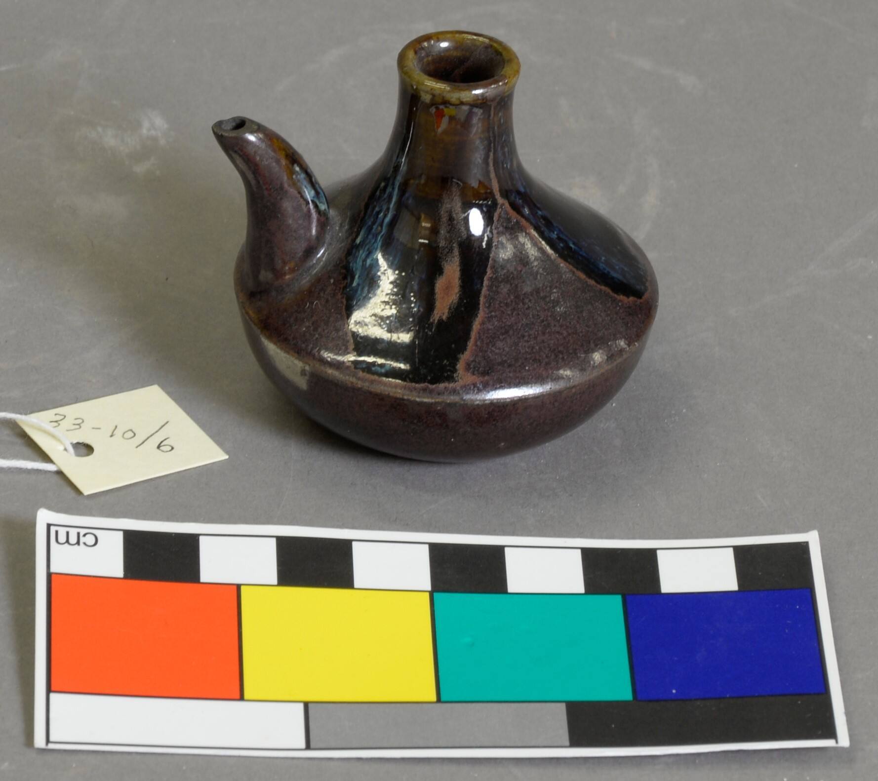 DescriptionGlobular in form with a spout on one side; light brown underglaze with dark brown speckles, and from the mouth running glaze wiht a tint of blue in it.