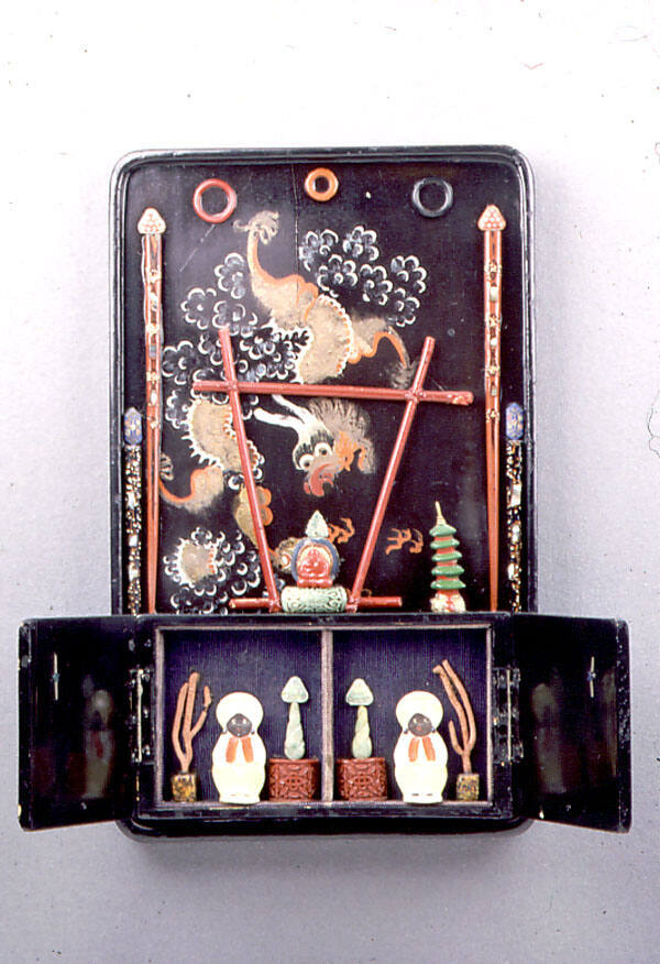 DescriptionThe small assemblage is made of a lacquer box set within a lacquer tray, decorated with an image of a floating dragon, and other various found objects. Set into the lower section of the tray is a box which opens to reveal two symmetrical scenes, comprised of small, seated figures flanked by plant forms. Decorating the surface of the tray above the box, various small objects, including an imitation, carved jade bead; a small plastic, red Buddha figure; and decorated chop sticks, are arranged and affixed to tCopyright© Betye Saar, courtesy the artist