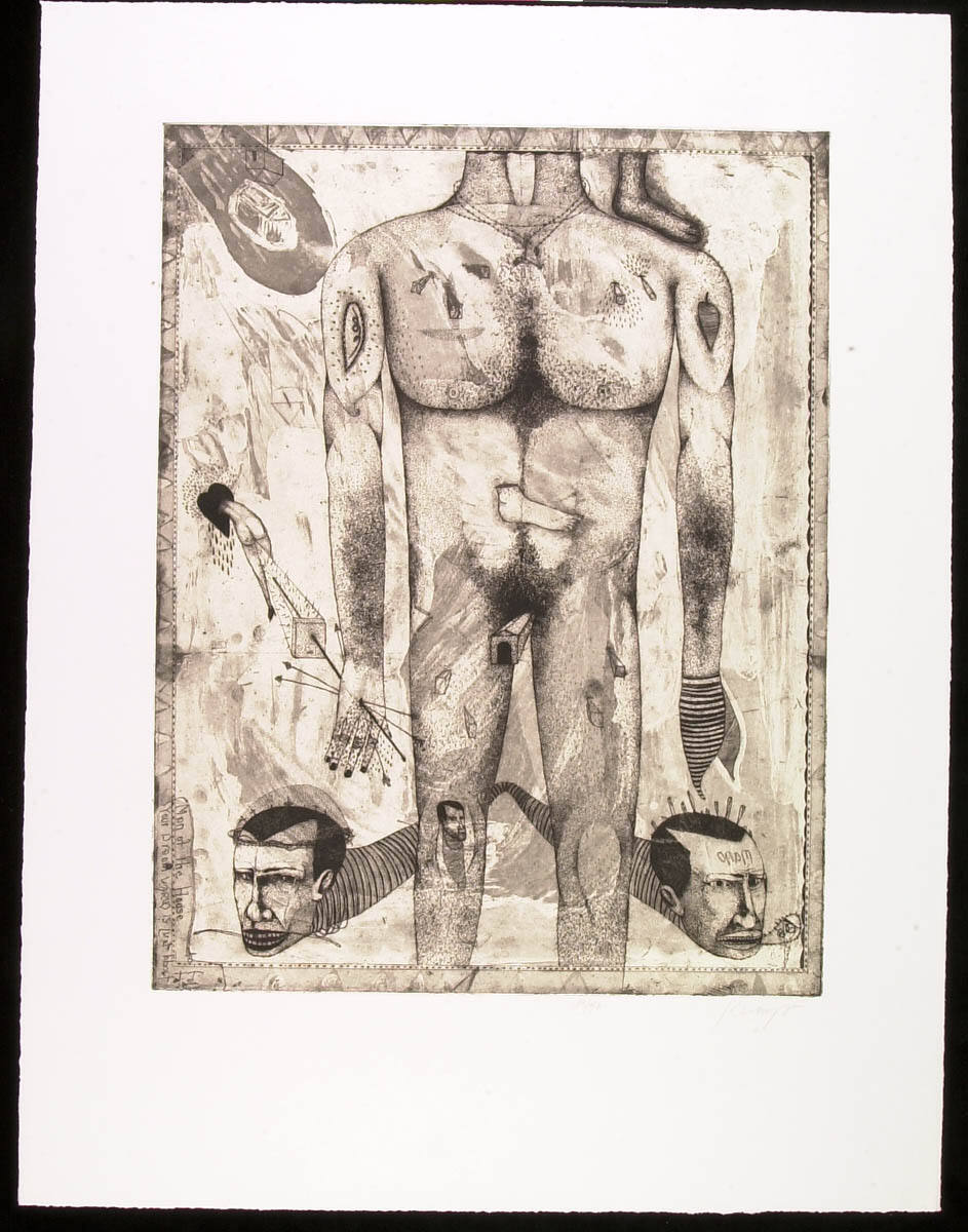 DescriptionView of a man's torso from the neck down. Included are various tatoos, a snakelike creature with two human (male) heads and the substitution of a house for the man's penis.Copyright© Kurt Kemp