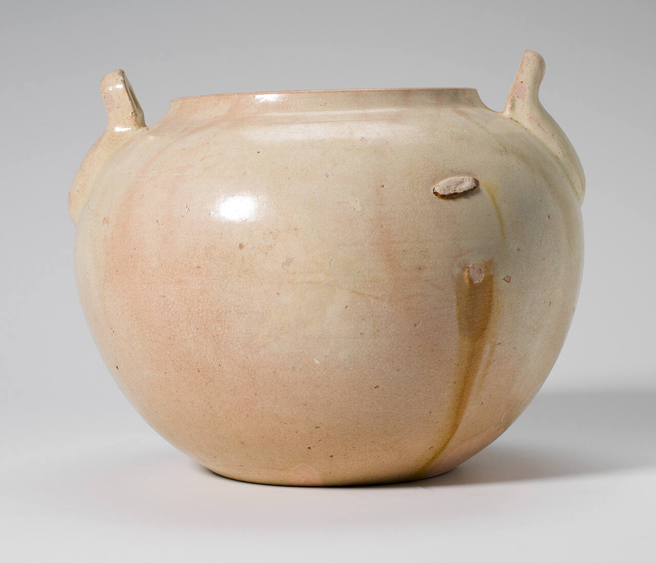 DescriptionShort, round jar with a pale green glaze and two loop handles at the rim.