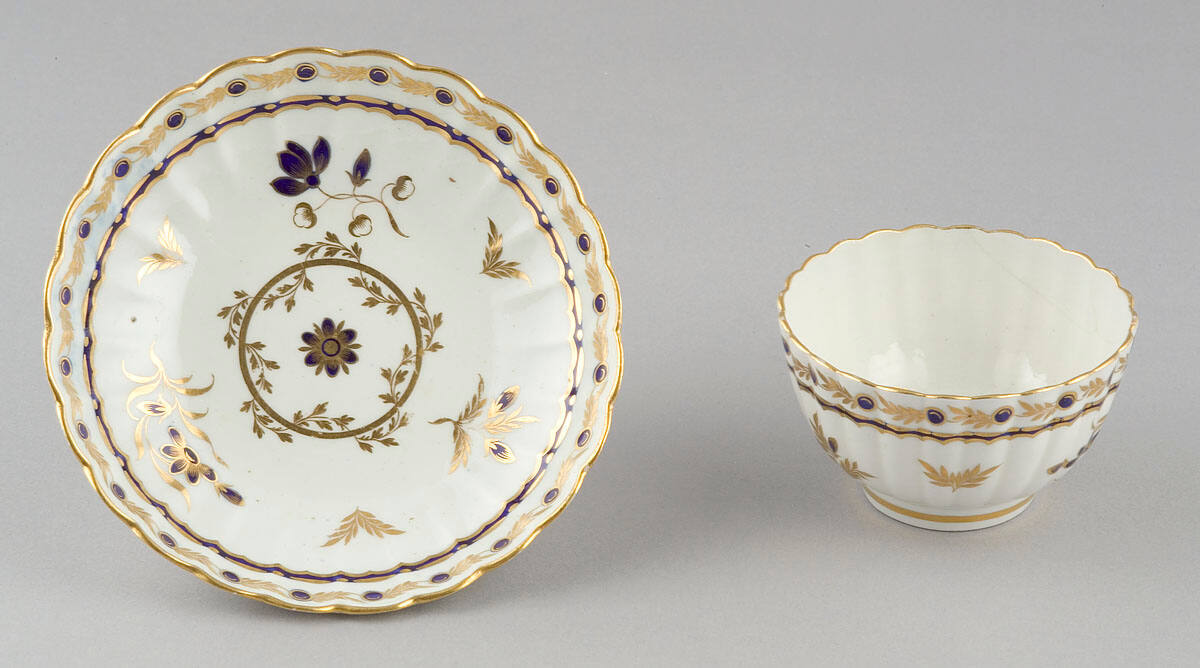 DescriptionCup: without handle; white porcelain with fluted sides decorated with single flower and leaf designs in gold and blue, and continuous leaf pattern around top. Saucer: white porcelain with fluted sides, decorated on inside with single flower and leaf patterns in gold and blue; continuous leaf pattern around edge.ProvenanceMargaret Cameron Chapman (née Mann, 1865-1935), Kansas City, MO, by 1935;