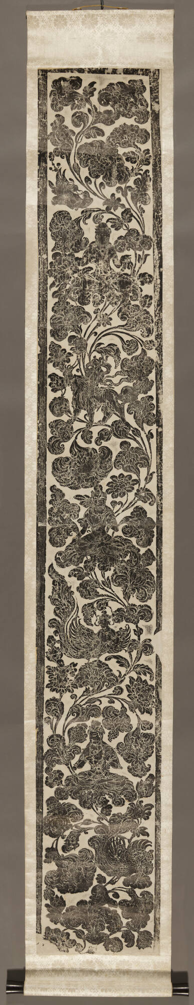 Made from a low-relief stone panel adorning a Buddhist monument, this ink rubbing reveals high-contrast forms, flowing lines, and traces of skillful carving. Decorative images, including birds, kalavinkas (hybrid human-bird musicians), and celestial beings seated among the flowing vines and flowers span the length of the rubbing.