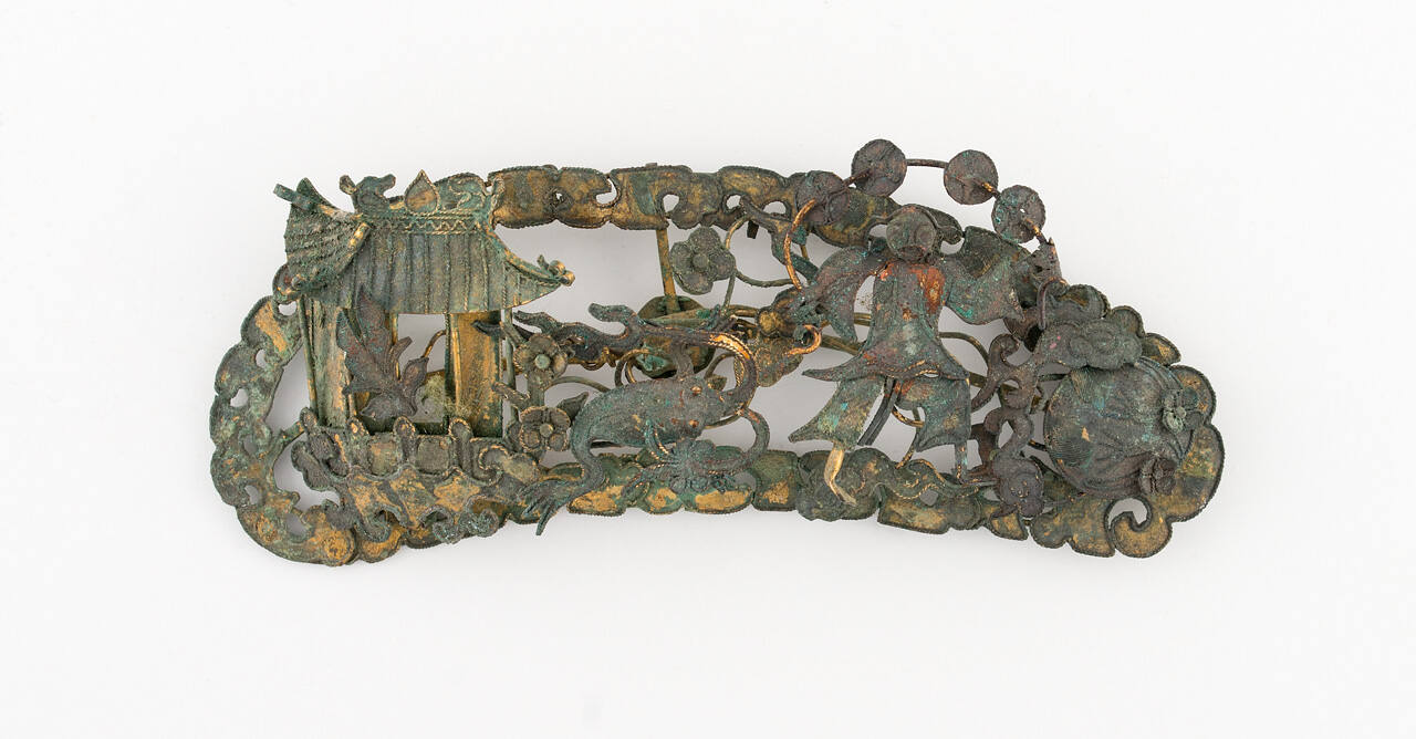 DescriptionScroll frame enclosing a pagoda, frog, man juggling a money chain, flowers and clouds. Traces of original gilt. Green patina.
