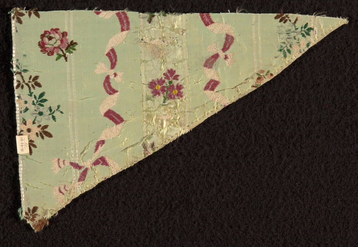 DescriptionGreen silk with white warp stripes; brocaded with polychrome silks