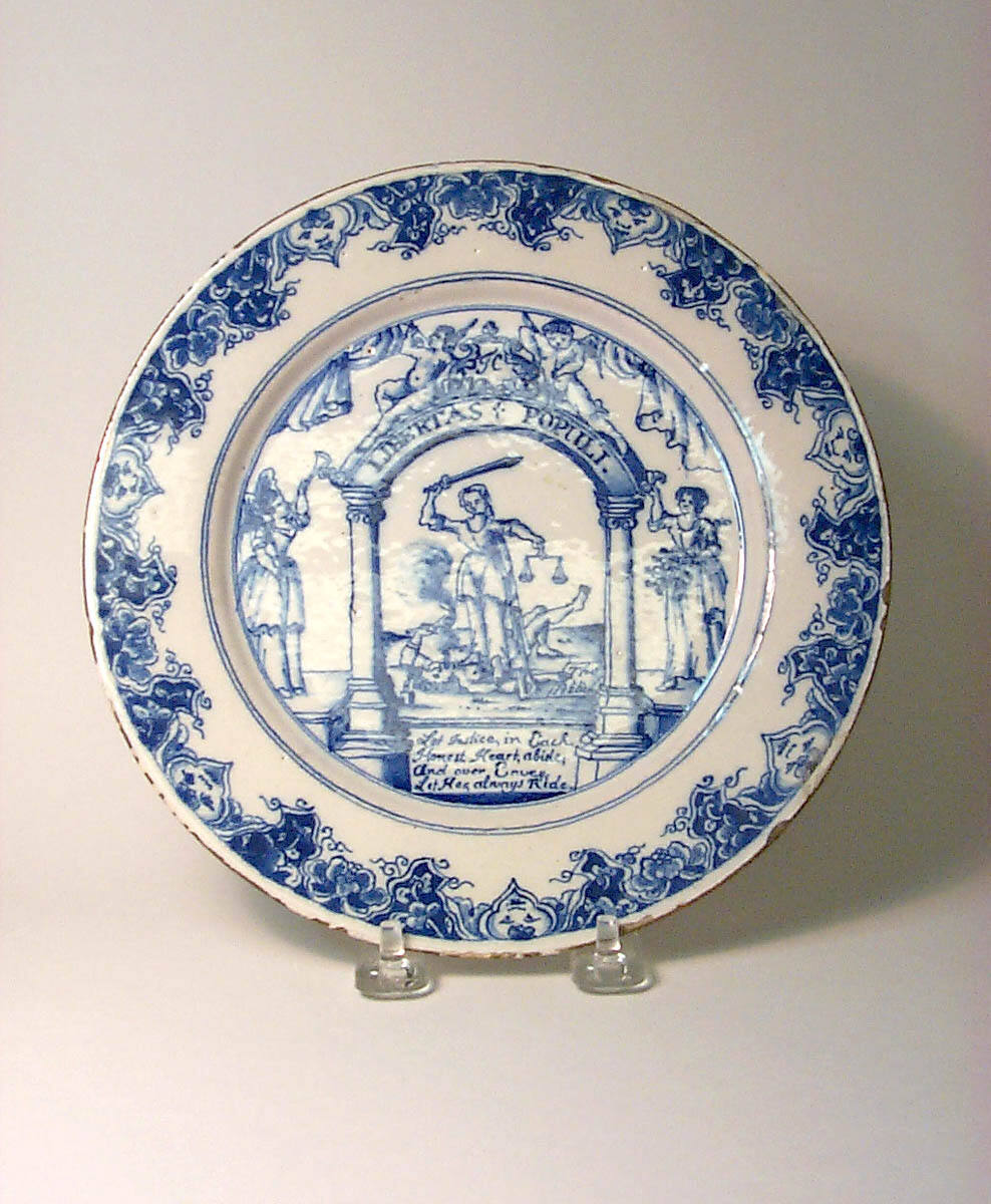 DescriptionPainted in blue. Arms, crest and motto- "in god is all our trust" - of the Tyler and Bricklayers Company centered within a narrow, brick-red border and a flowered rim.