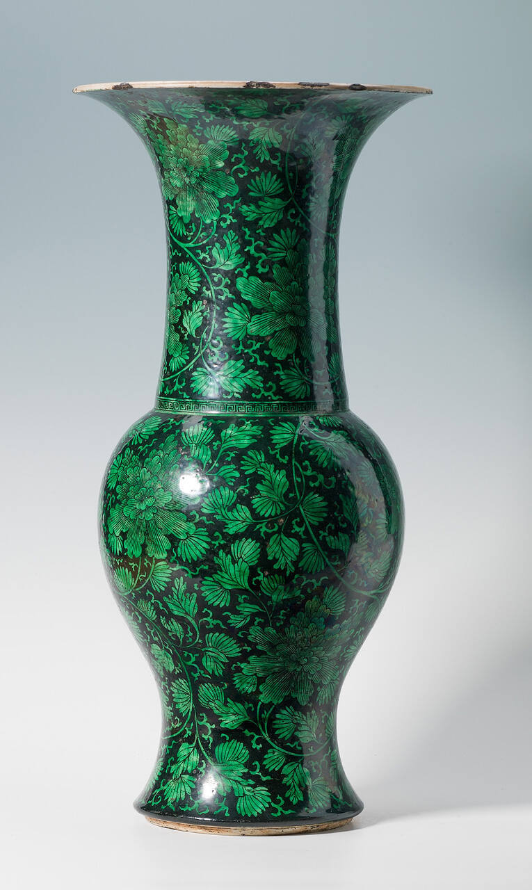 DescriptionBlack ground vase with green floral decorations.