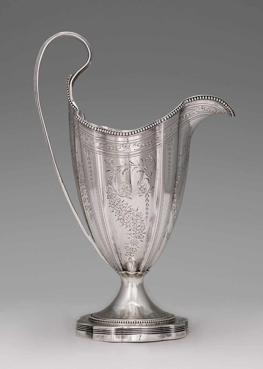 DescriptionHelmet-shaped silver cream jug with shaped base and thread handle. The edge of the jug is decorated with bead wire. The body is engraved with "bright cut" work of flowers, leaves, and feathers.Gallery LabelThe cascading flowers and delicate scrolls decorating this cream jug achieve their sparkle from a type of engraving known as bright cutting. With this technique, the design is cut into the metal in small, angled gouges creating a faceted, reflective indention. The base and top edge of the jug are ornamented with rows of tiny balls known as beading, a characteristic feature of Hester Bateman's work. From a family of prominent silversmiths, Bateman and her husband John began the business that continued for three generations.