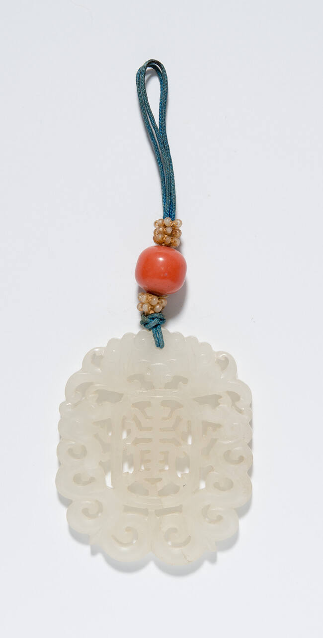 DescriptionCarved white jade pendant suspended on short blue silk cord with carnelian and pearls.ProvenanceElla Anna Loose (née Clark, 1860-1945), Kansas City, MO, and Washington, DC, by 1934 [1];