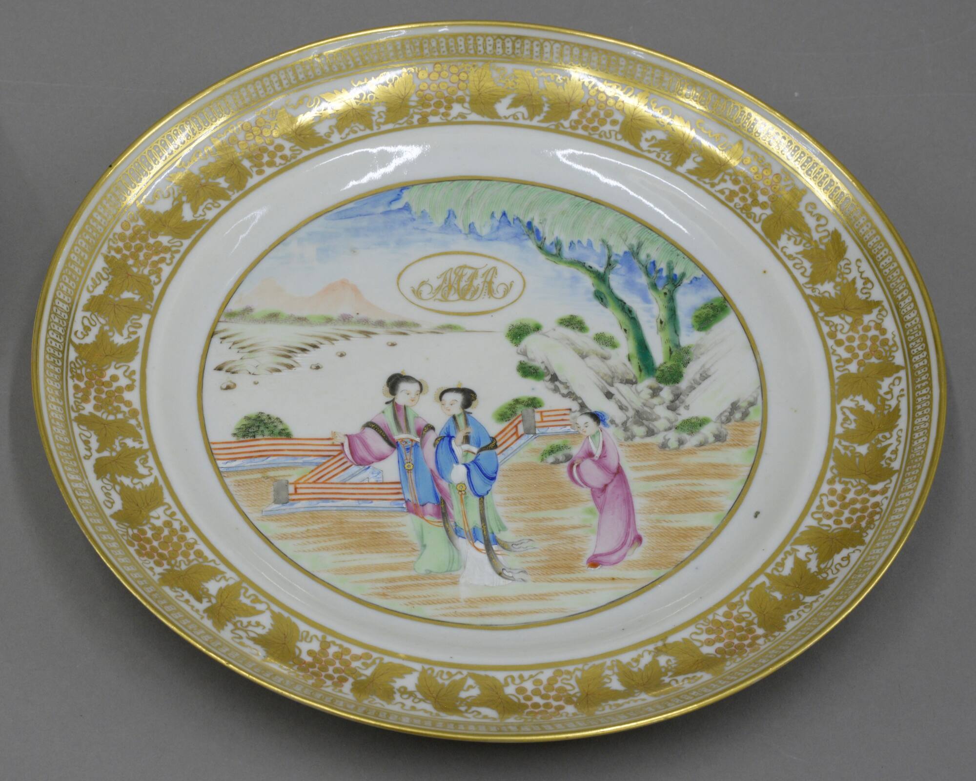 DescriptionDecorated with the initials of the unidentified owner. Part of seventy-seven piece tea service. In plates and on sides of vessels and containers is scene in famille-rose style with gold monogram, MTA, above figs. Border design of gold grape bunches and leaves in plates and on lids and upper sides of vessels. Lid knobs of jam dish and pots, gold berries. Handles of truncated conical pots and cylindrical sugar, entertwining "vines" ends of which attached with gold leaves.