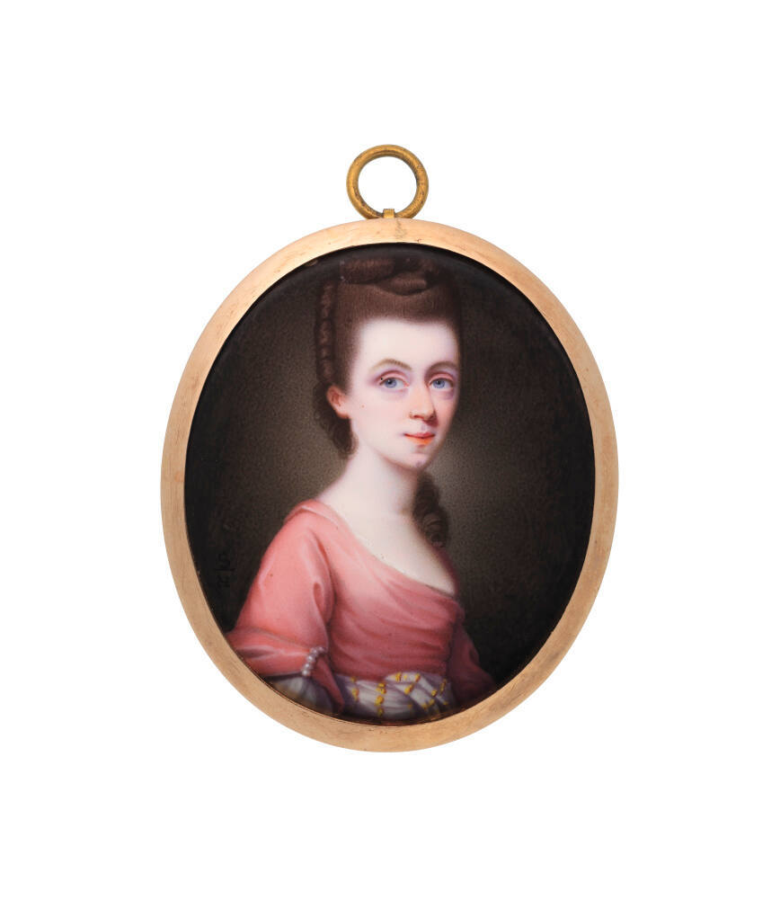 DescriptionPortrait miniature of a woman with natural hair wearing a pink gown before a brown background.Exhibition History
