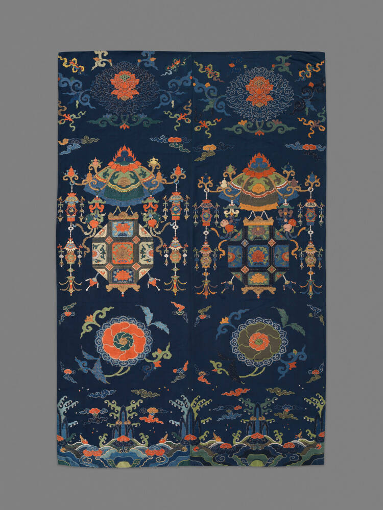 DescriptionTwo panels are sewn together. Used in Lantern Festival.Gallery LabelThis brightly colored hanging consists of two panels sewn together. The panels may have belonged to a larger set of wall decorations or furniture covers. The elaborate lanterns at the center of each panel - along with flowers, corals, jewels, and clouds - signify wealth and happiness. This type of wall hanging (depicted in the upper right of the image below) decorated upper-class homes during the Lantern Festival. Many Asian people still honor the Lantern Festival on the fifteenth day after Lunar New Year by displaying elaborate luminaries in public spaces.