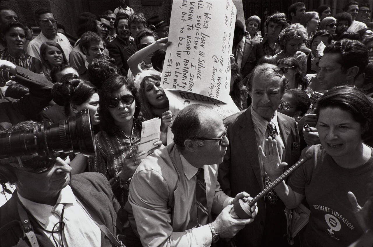 Gallery LabelIn this image, a dense crowd gathers to watch an animated exchange between a male news reporter and a woman at a women’s liberation march. Included in the frame is a television news camera. Garry Winogrand made this picture as part of his project Public Relations, for which he was awarded a 1969 Guggenheim Fellowship to “photograph the effect of media on events.” Images such as this one deconstruct the idea that newsworthy events are spontaneous occurrences: on the contrary, Winogrand’s image emphasizes their staged theatricality.