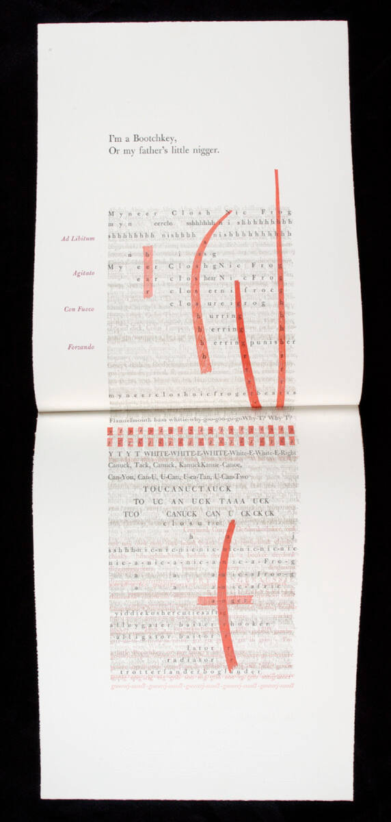 DescriptionText on two vertically joined sheets, red thread across top recto, wide black and blue marbled strip, top verso. Blind-stamped: What are you?; printed in black Bulmer type: I'm a Bootchkey,/ Or my father's little nigger. A vertical rectangle consisiting of words in alphabetical order in gray on top sheet, gray and light red on bottom sheet, 35 lines in black Bulmer roman type. Some letters. And 3rd lines, bottom sheet, over a small red rectangle. Notations in red: Ad Libitum, Agitato, Con Fuoco, Forzando. 7 bCopyright© Norman J. Wagner
