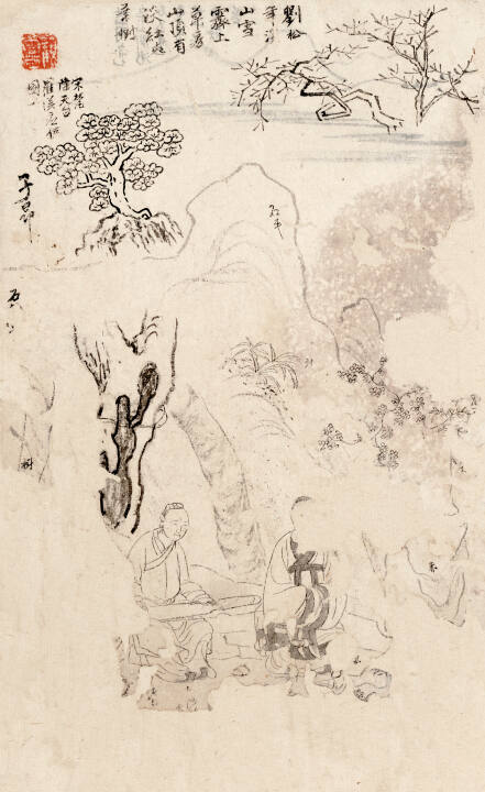 Gallery LabelThis page comes from an album of sketches based on old masterworks and used to create paintings like The Pastimes of the Palace Ladies. The notes on the sketches record the artists and titles of original paintings as well as painting methods, colors, etc. The album is marked with Gu Jianlong’s seals and is one of many that he made over the course of his long professional painting career.