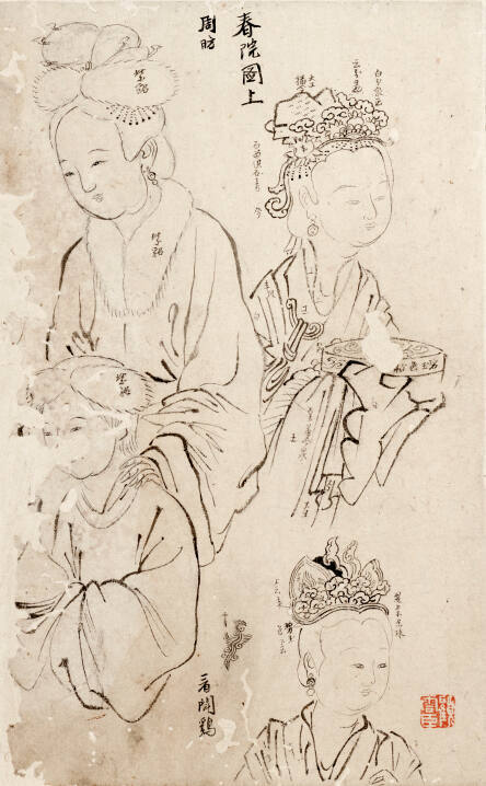 Gallery LabelThis page comes from an album of sketches based on old masterworks and used to create paintings like The Pastimes of the Palace Ladies. The notes on the sketches record the artists and titles of original paintings as well as painting methods, colors, etc. The album is marked with Gu Jianlong’s seals and is one of many that he made over the course of his long professional painting career.