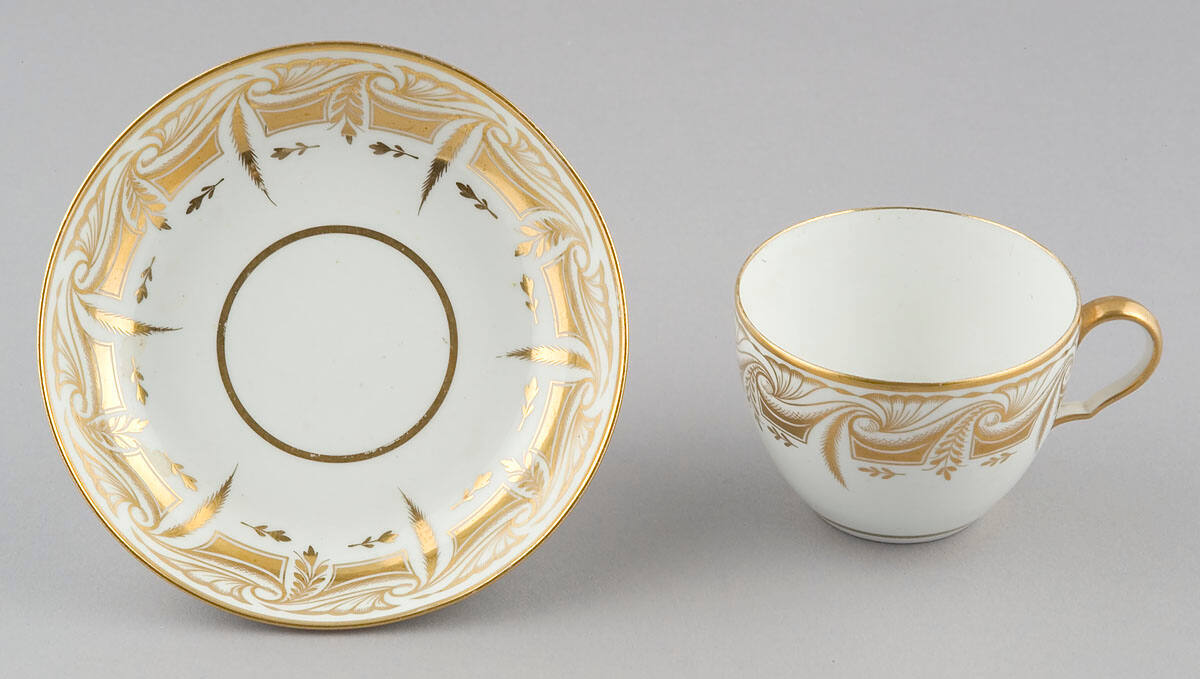 DescriptionCup: of white porcelain, gilt handle, decorated around top with wide border of gilt in formal design, and continuous leaf pattern. Saucer: of white porcelain decorated on inside with gilt border in formal design, and continuous leaf pattern.Provenance