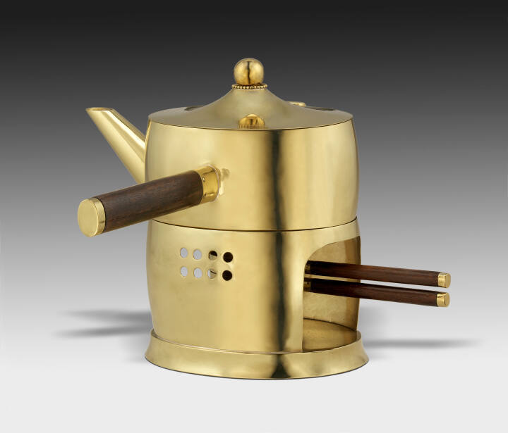 DescriptionSamovar is in three parts: a kettle, a base, and a burner unit. The kettle is oval-shaped with a single straight wood handle attached to one of its long sides. The kettle's top tapers upward toward a ball-shaped knop. The base is also oval-shaped. On each of its long sides, the base is decorated with two parallel rows of small, circular cutouts; each row has four cutouts. The oval-shaped burner rests inside the base. It is composed of a flat-topped lid with a single straight wooden handle which fits onto a hollow oval body. The body of the burner unit also has a single straight wooden handle.Gallery Label"To the age its art, to art its freedom." These words, spoken by Austrian architect and designer Josef Hoffmann, underscore his belief that art need not copy the past but rather reflect present-day styles. Freed from historical constraints, Hoffmann abstracted his designs into simple geometric forms. Decorative metalwork provided Hoffmann with a malleable medium to be hammered, polished, punched or enhanced with applied ornamentation. This samovar, composed of a kettle with a base and burner to heat water for tea, exemplifies Hoffmann's ability to combine multiple, functional parts into a unified form with subtle ornamentation. Despite the samovar's simplicity and moderately priced materials, its golden surface and dark wood illustrate Hoffmann's rich and elegant aesthetics.