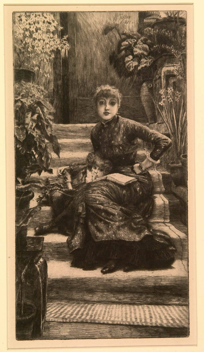 Gallery LabelJames Tissot was a successful painter and printmaker known for his stylish depictions of everyday life. Unlike his earlier works, etchings like this from the 1880s bear the stamp of a new artistic source: photography. This print was based on a photograph of the artist’s mistress, Kathleen Newton, sitting on the steps of his studio with her niece, Lilian Hervey. Lilian later recounted that Tissot would pose his models and make a photograph, which he then used as the basis for his paintings and prints.