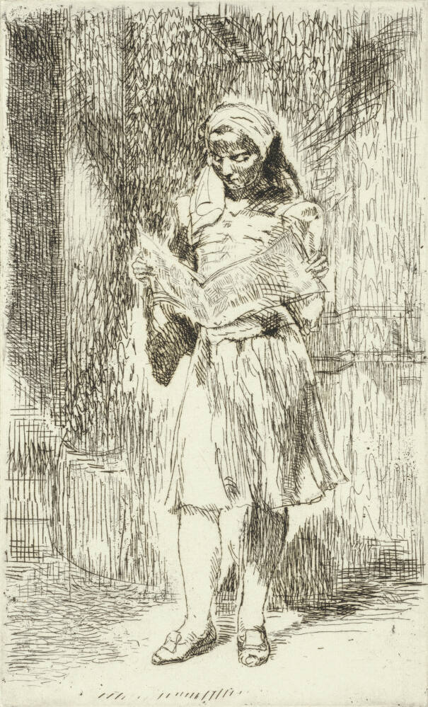 The painting Girl with a Newspaper is the result of Isabel Bishop’s unique and intensive preparatory process. Bishop first made small sketches from life. These drawings became the basis for etchings, like the one here. She then enlarged the etching with a photographic copying machine to establish the future painting’s size. Using a limited palette and horizontal brushwork, she created a web-like surface that knits together foreground and background. She then used tempera to draw the figure with a network of lines, echoing the graphic quality of the etching. The working girl who is the subject of Bishop’s painting resonated with the social dynamics of the mid-1940s. The number of women in the workforce had risen dramatically earlier in the decade as a result of World War II. This sparked debate when returning soldiers expected to resume their prewar jobs.