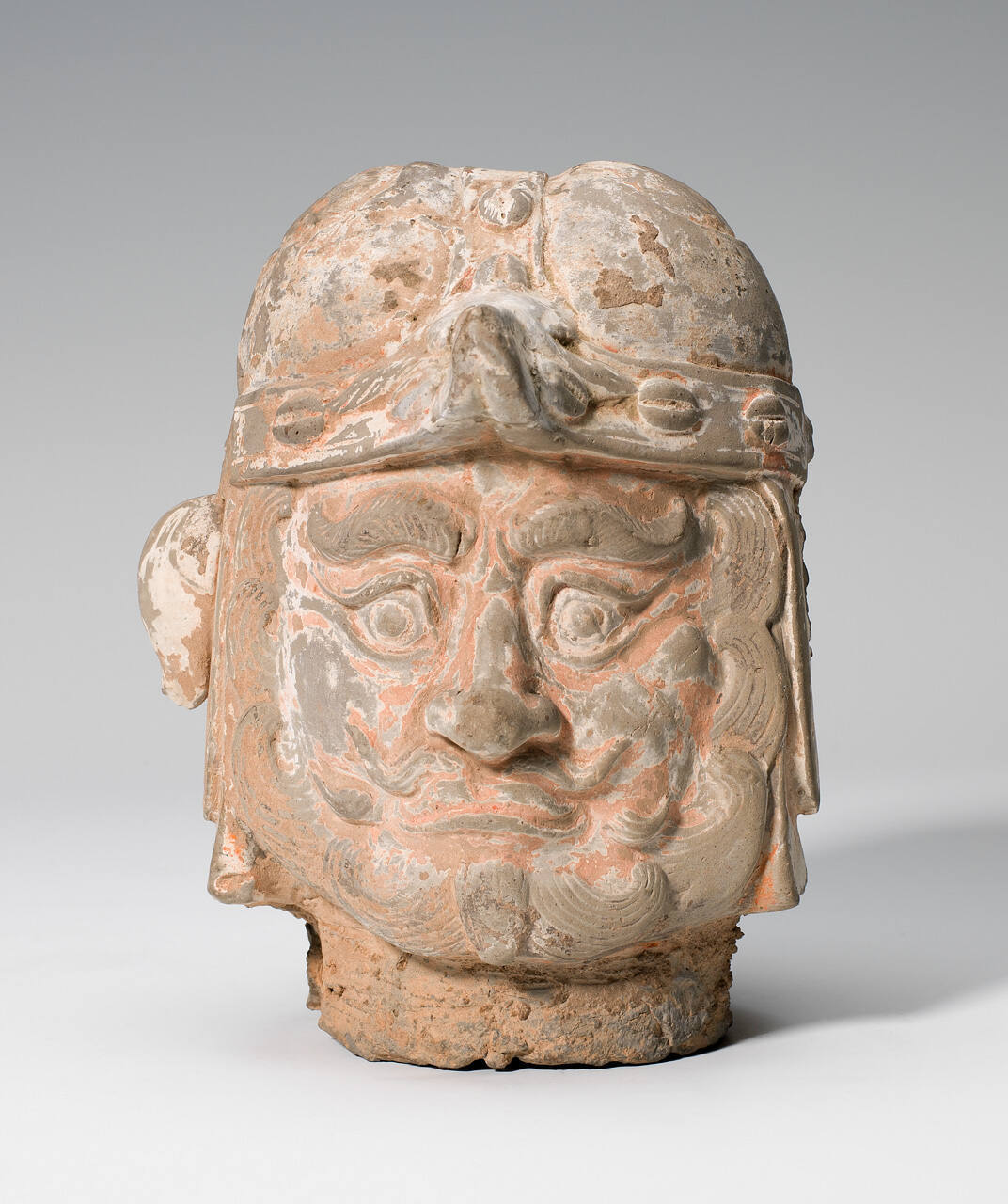 DescriptionHead of a warrior wearing a helmet, with stylized curls at mustache and beard. Traces of red and blue polychrome.