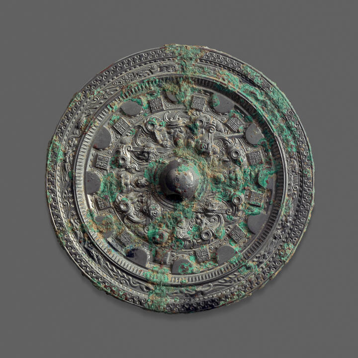 DescriptionRound mirror. Back ornamented in high relief. Around central knob are four Taoist deities flanked by dragon-like animals holding bars in their mouths. Border of 12 semi-circles and 12 squares with 4 seal characters in each. Outer border of dragons and other animals with cloud scrolls. Silver surface and heavy green patina.