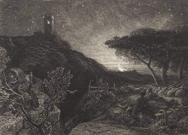 Through skillful rendering, Palmer created a mystical scene in which the waning moon casts an eerie light across the etching. Although the scene was inspired by a poem, the tower is based on one that stands on Leith Hill in Surrey, England, and was visible from the studio at Palmer’s house at Mead Vale, where the artist relocated in 1862.