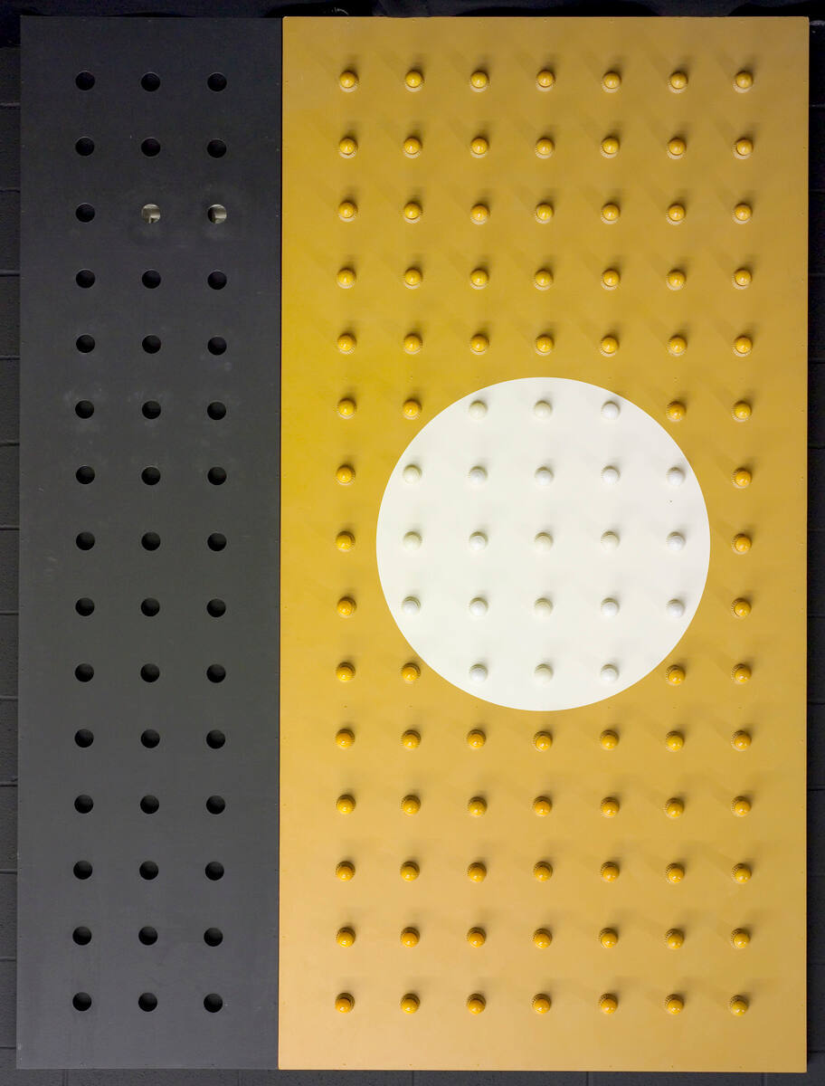 DescriptionOne orange panel with 105 light bulbs and one black panel with 45 holes; wider panel painted orange with white circle in center; at top and bottom, 5 rows of 7 orange bulbs each; at center 5 rows, orange and white bulbs. Narrow black panel has 15 rows of 3 black holes; 2 holes left in 3rd row from bottom contain deep-set round mirrors.Copyright© Estate of Howard W. Jones