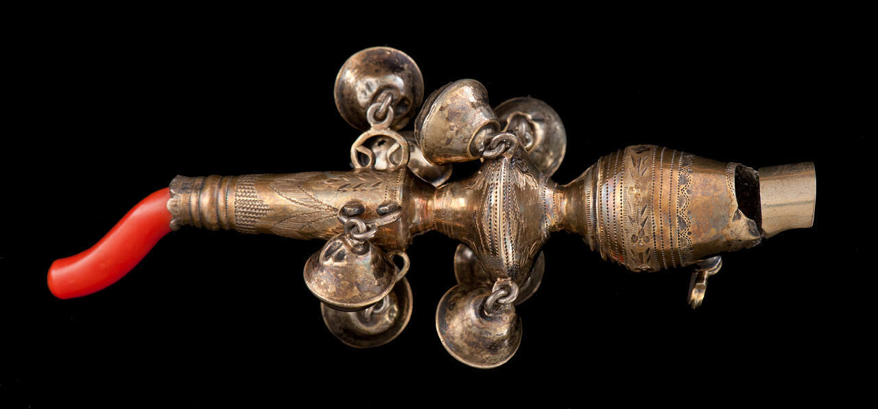 DescriptionSilver-gilt rattle and whistle with coral "horn" against the evil eye; engraved with rings and floral designs; chain ring attached under whistle mouth piece and 8 small rattle bells attached to body.ProvenanceVirginia Eaton George (1889-1975), Kansas City, MO, by 1955;