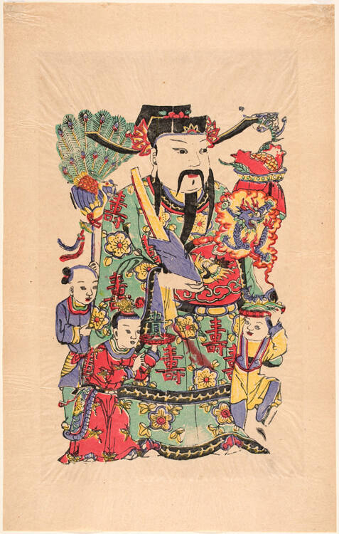 Gallery LabelComplementing the martial door gods are these heavenly officials, who dress in the attire of imperial civil officials. They are assigned to watch the entrances of various rooms inside the house, where the doors are often beautifully designed with openwork like the wood panel here. These officials present symbolic objects that will bring wealth and honor to the rooms. Specifically, the official on the top print presents a scroll inscribed with blessings; the center pair presents a fish and a peach that symbolize prosperity and longevity; and the bottom pair amplifies the blessings with five children, each holding a lucky symbol.