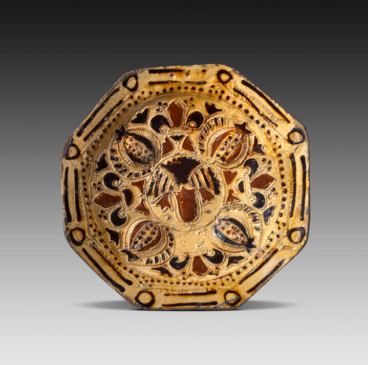 Gallery LabelThe pomegranate motif, probably derived from Near Eastern metalwork or textiles, alternates with a fleur-de-lis, or iris motif, symbolic of France, on the inner border of this charger.
