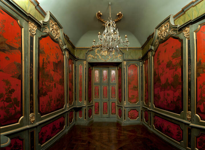 This room was originally part of a palace owned during the mid-18th century by San Martino d'Agliè di Garessio, a member of the Savoy royal entourage. The room had four points of entry: one from the central corridor of the house, most likely the primary entrance; French doors that led to a terrace (across from the viewer's vantage point); and two smaller doors covered with red lacquer panels to the right, which led to internal staircases or service areas.