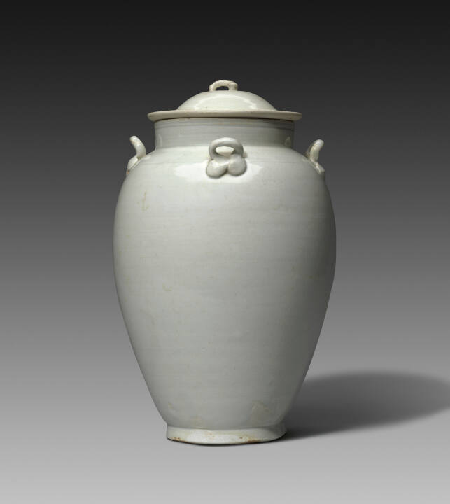 DescriptionPorcelaneous jar with lid, having an elongated oviform body with four loop handles on the high, sloping shoulders; a wide, short neck and flat dome-form lid with a flat expanding lip rim, topped by a loop-form finial. Coated all over with a light blue Ying Ching glaze.ProvenanceMrs. George H. Bunting Jr.;
