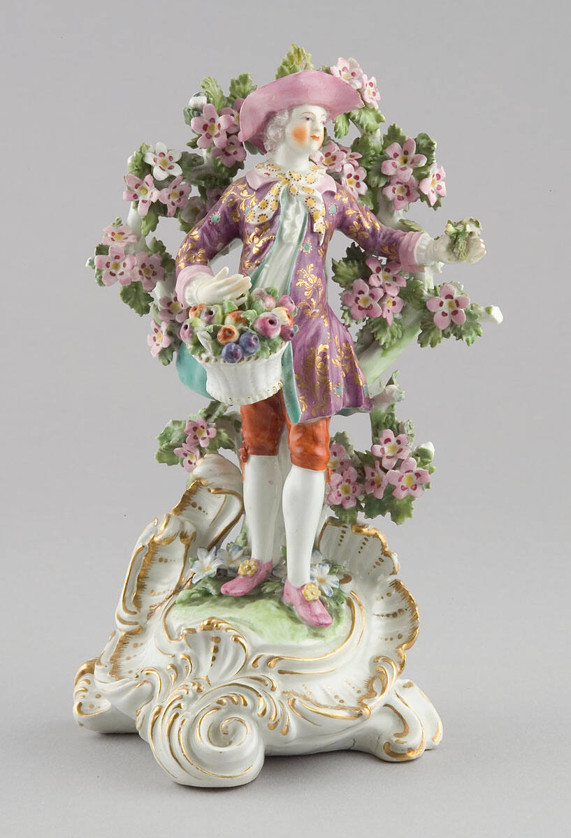DescriptionA youth wearing a tricorn hat, a purple and gold-fiugured coat and orange knee breeches, stands on an irregular-shaped base before an arbor background of pink flowers and green leaves. His upright hand rests upon a basket of fruit and in his left he holds a flower.