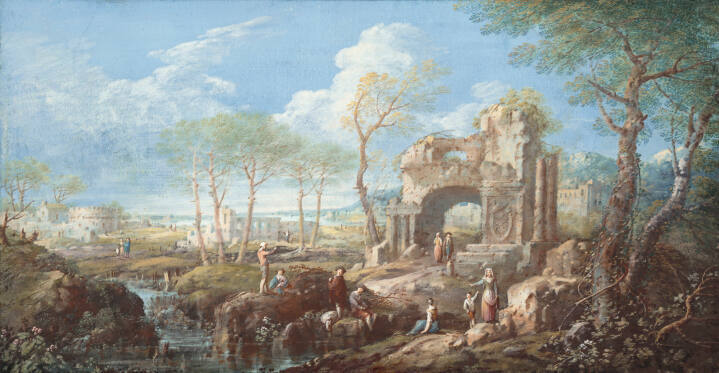 Here, decaying ruins blend into the landscapes around them. Inspired by real places, these views are imaginary, meant to show the artist’s inventiveness. Each is known as a “capriccio,” a term for a composition that combines real and imagined elements. Capricci were popular souvenirs from the Grand Tour, a cultural tour of Europe undertaken by the elite as part of their formal education.
