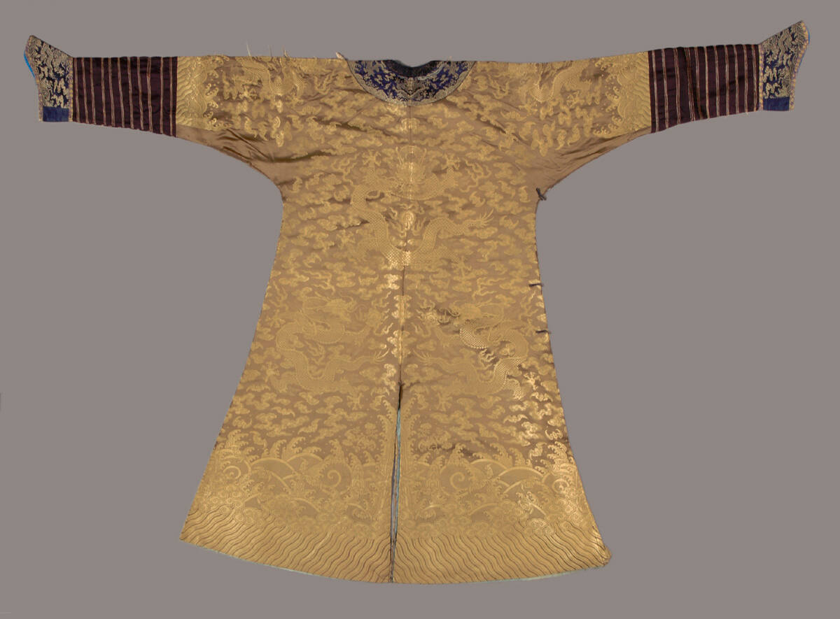 DescriptionYellow on brown ground; seven dragon pattern with waves and clouds; blue brocade border with dragons on neck. Blue satin sleeves and cuffs.