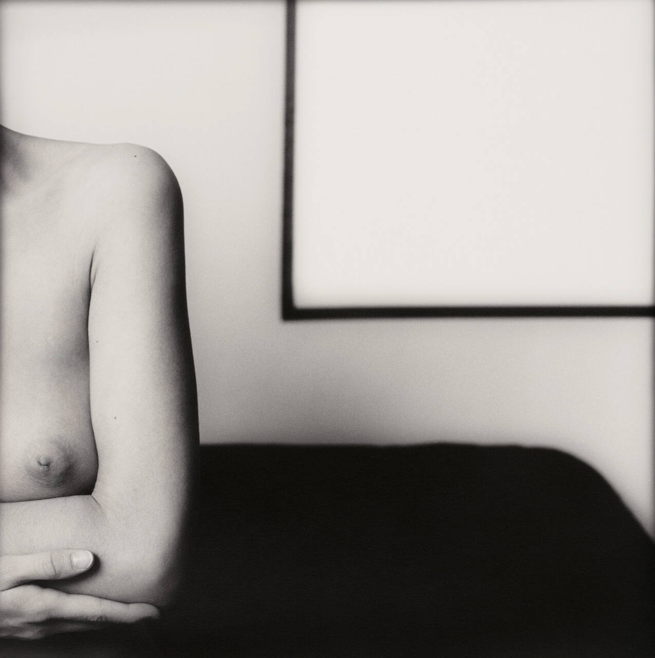 DescriptionClose-up of a nude female placed at the left margin so that most of the image is cut off, except her left shoulder, upper arm, and breast. In the background is a large, white square.
