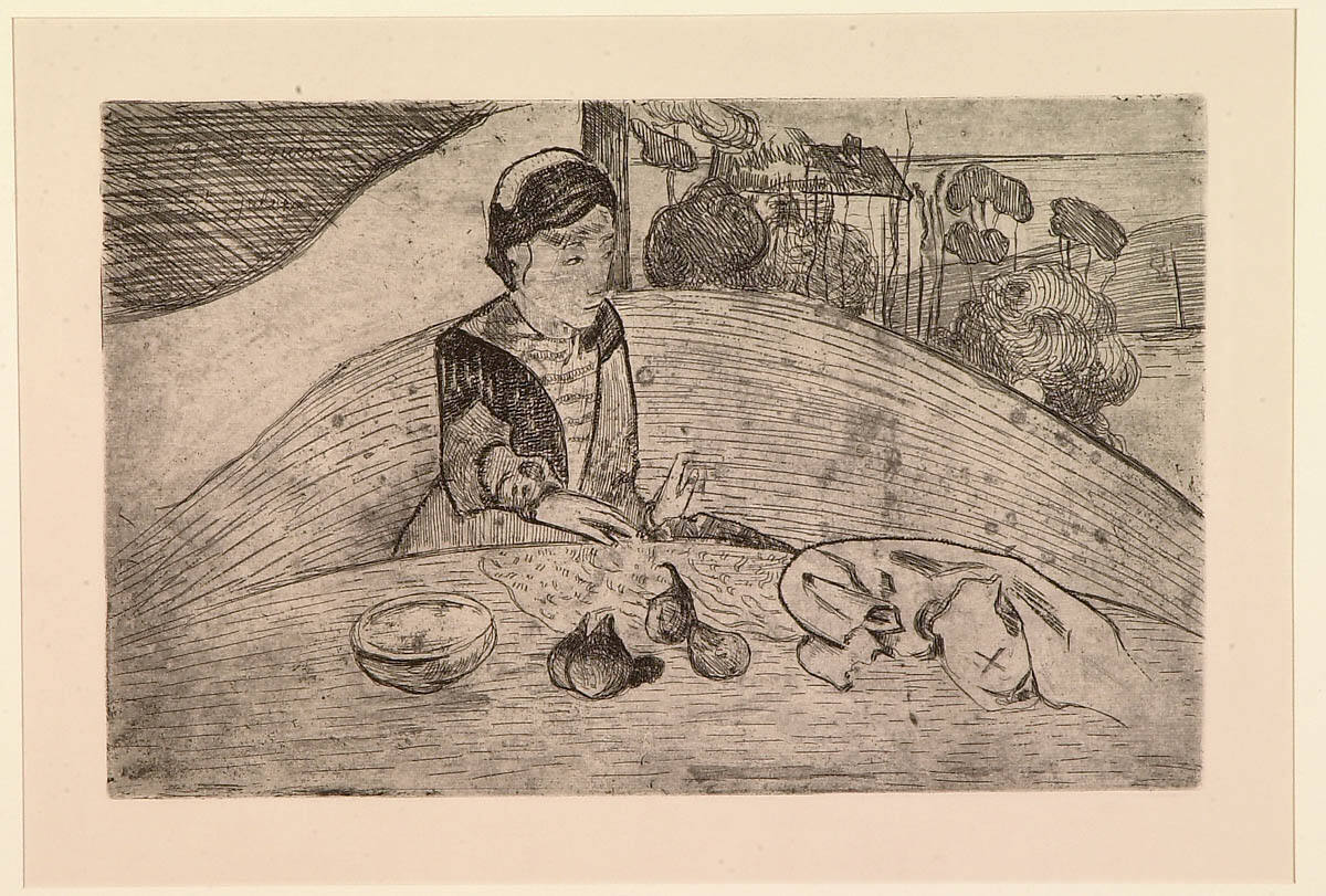 Though it is native to the Middle East and western Asia, fig trees thrive in many places throughout the world, including Brittany, in northwestern France. Paul Gauguin’s friend and fellow collaborator on this print, Armand Séguin, had a fig tree in the backyard of his home in the small Breton village of Saint-Julien. Its bounty must have supplemented Séguin’s table and sparked Gauguin’s imagination, as seen here. Gauguin employed simplified forms and a crude drawing style to express the primitive qualities he associated with this remote region.